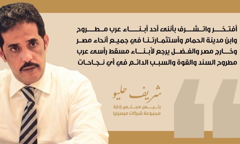 واستطرد: “أفتخر واتشرف بأننى أحد أبناء عرب مطروح وابن مدينة الحمام واستثمارتنا في جميع أنحاء مصر وخارج مصر والفضل يرجع لأبناء مسقط رأسى عرب مطروح السند والقوة والسبب الدائم في أي نجاحات”.